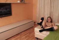 Loredana is kicking back on the couch in a cute little skirt and knee high socks. Her legs are in great shape and this mature vixen just loves to spread them. She goes full nude, digging on her hairy pie, then grabs a dildo and starts rubbing that furry muff. She strokes her furry pussy with that dildo, getting extremely hot and bothered. Enjoy!